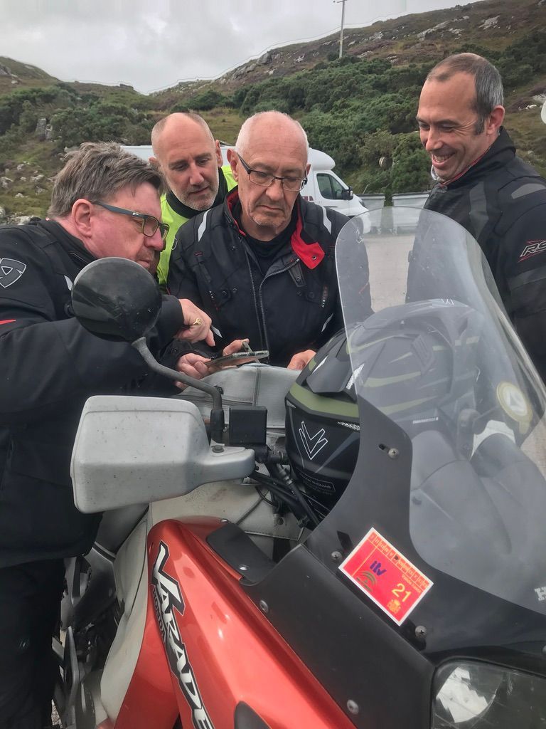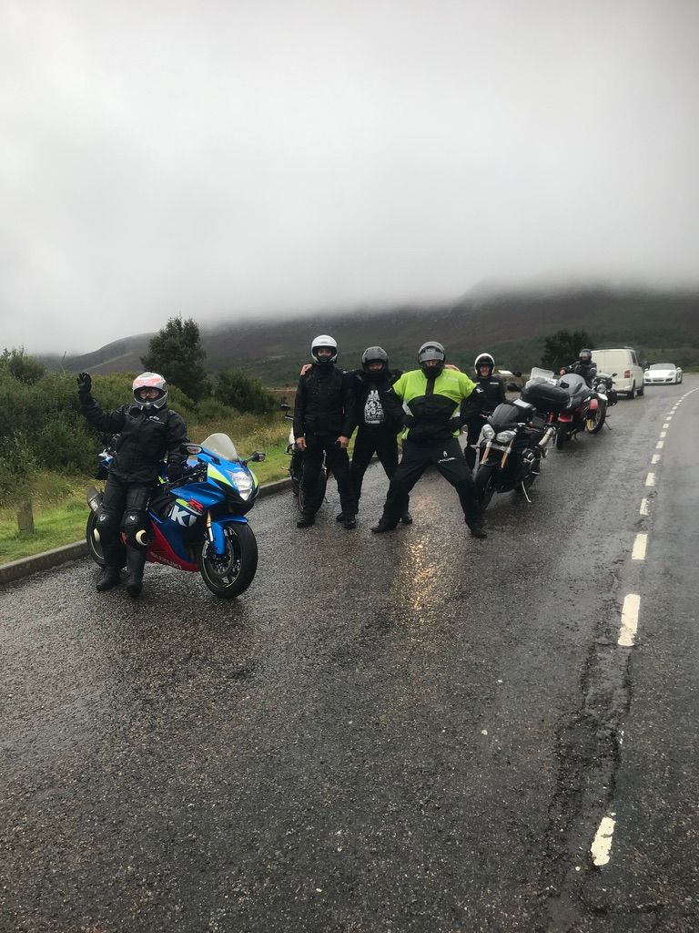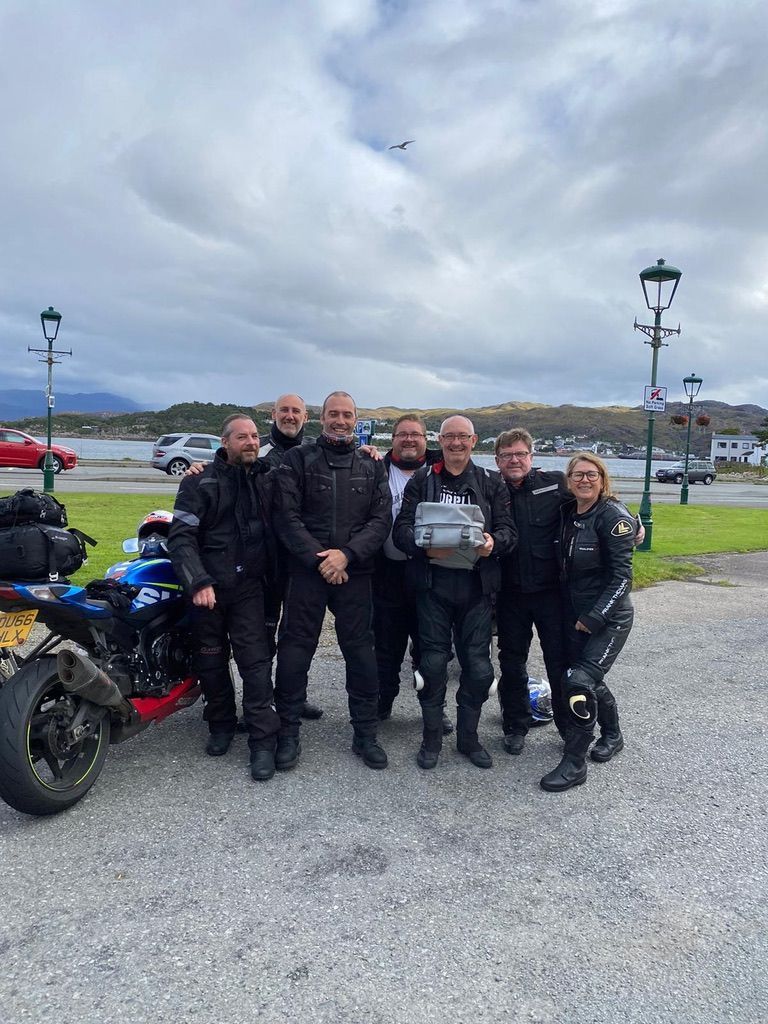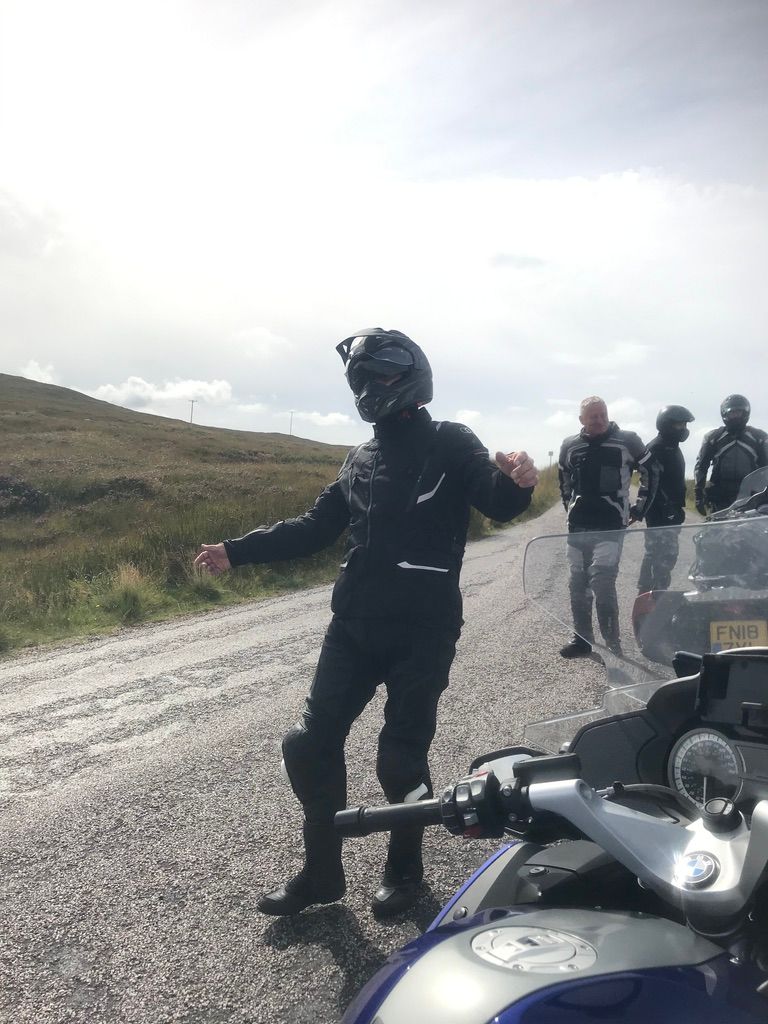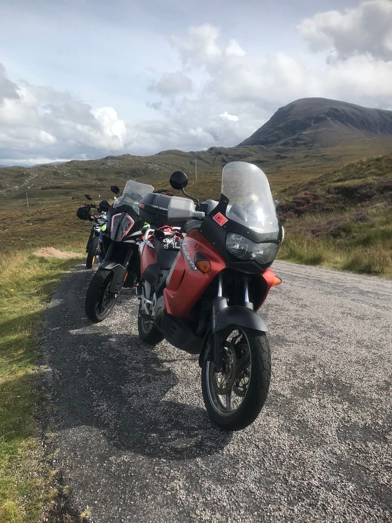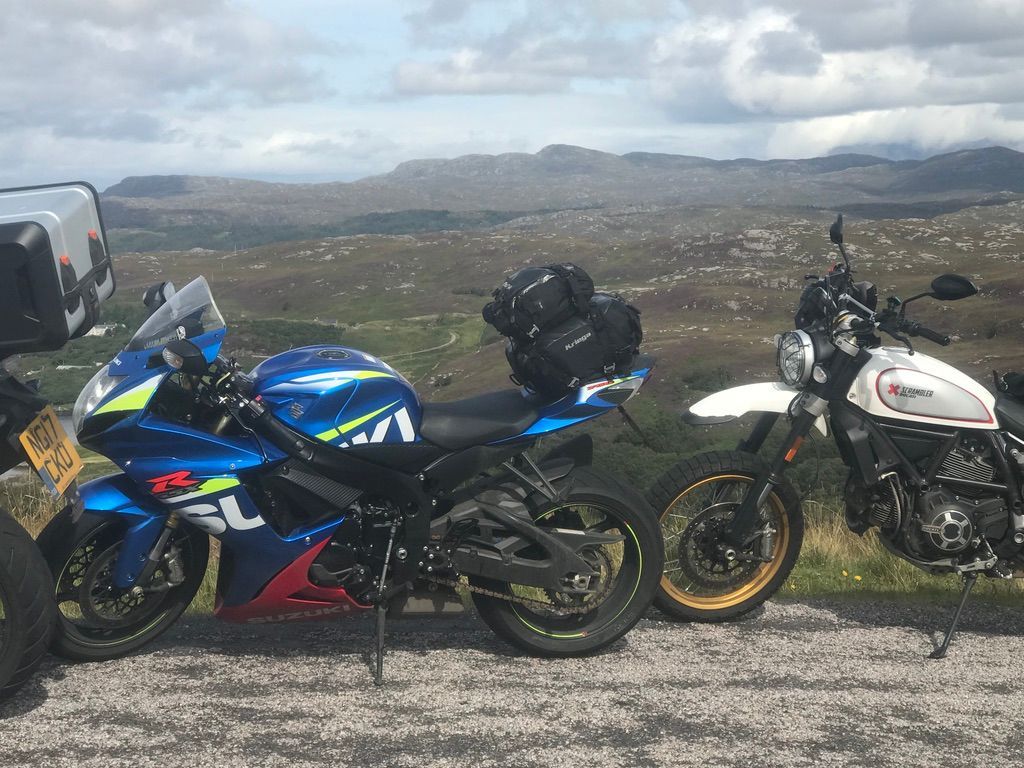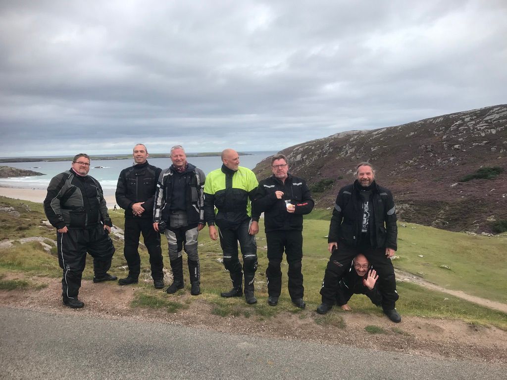 The riding was bloomin fantastic with every type of road you can imagine. Dry/ smooth/ wet of course/ bumpy as hell/ single track/ fast/ slow, and the scenery! If you like a vista “well it's the place for you” We had tons of highlights and here are a few. The Bealach na Ba across the Applecross peninsula, a wet day with low clouds so the views were (well non existent) and the midges (other beasties are available) ate our faces off but a spectacular ride nevertheless. Secondly our diversion onto The Isle of Skye (great weather that day) an unbelievable day's ride, fast and memorable! Then the area known as Assynt (yes that's correctly spelt and I bet not many Scots have heard of it) that includes the village of Drumbeg, great whisky and the sheep making other sheep (if you know what I mean, really funny but I guess you had to be there)